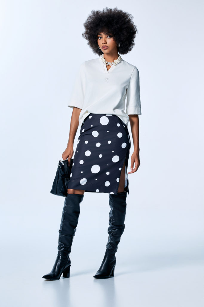 透過不對稱剪裁、異材質拼接,衝突中碰撞出雋永迷人的美感,iROO 經典都會黑白系列運用拼接蕾絲材質及波卡圓點元素,搭配直筒鉛筆褲或帶光澤感的闊腿褲、商務休閒風傘裙,都能成為無論是職場日常或是週末約會,皆貴氣中充滿自信能量,完美展現現代女性忠於自我、不屈就的百搭單品。