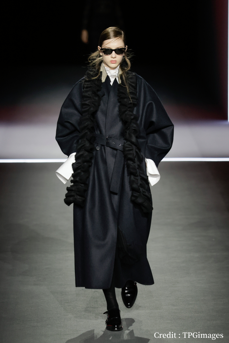 透過立體落肩剪裁結合延伸比例的肩線,讓經典黑大衣更有分量感,抓皺荷葉裝飾也為整體造型瞬間加分。