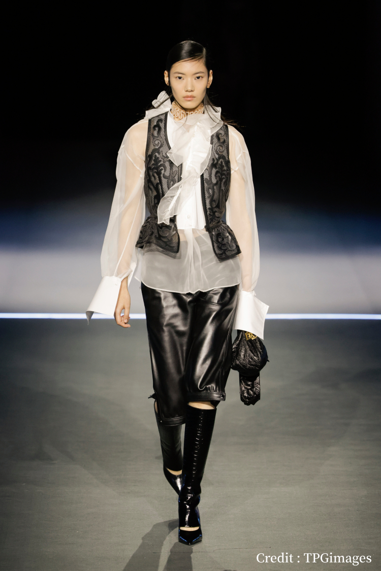 白色雪紡上衣運用袖口異材質拼接及不規則荷葉長領,打造出柔中帶剛廓形,搭配黑色雕花背心與及膝皮裙,多樣材質塑造出獨一無二的個性層次。