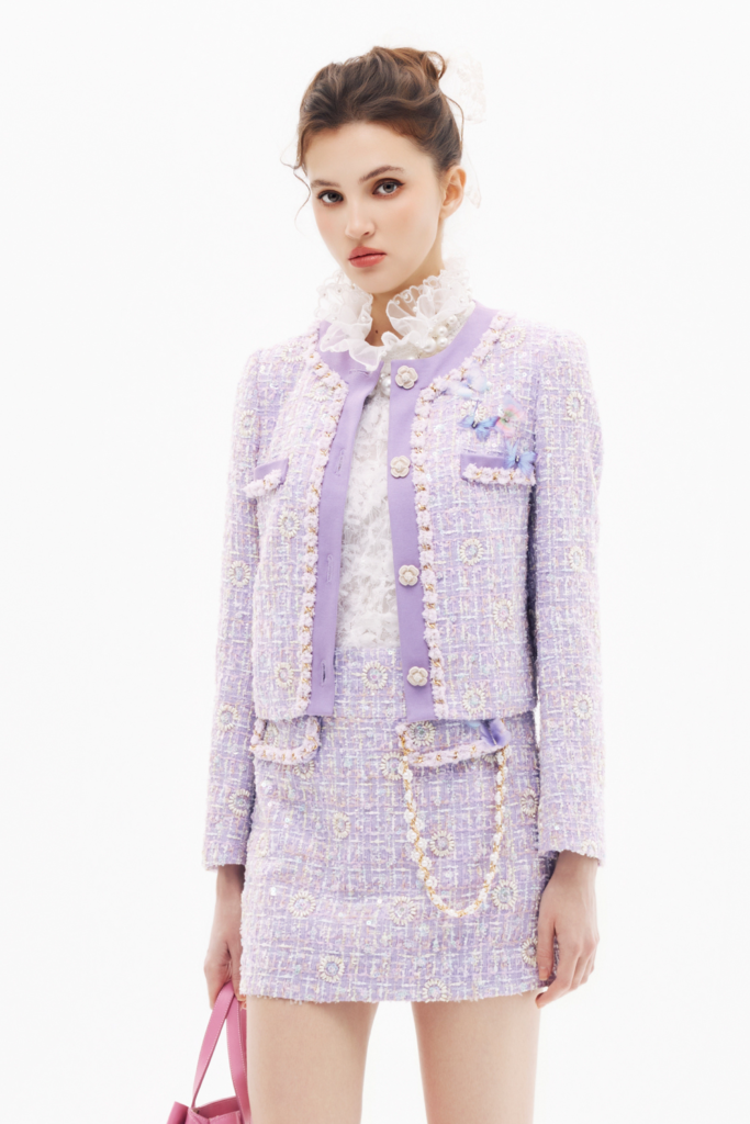 綴光澤睫毛蕾絲上衣、小香風柔紫花呢紗短裙、小香風柔紫花呢紗外套