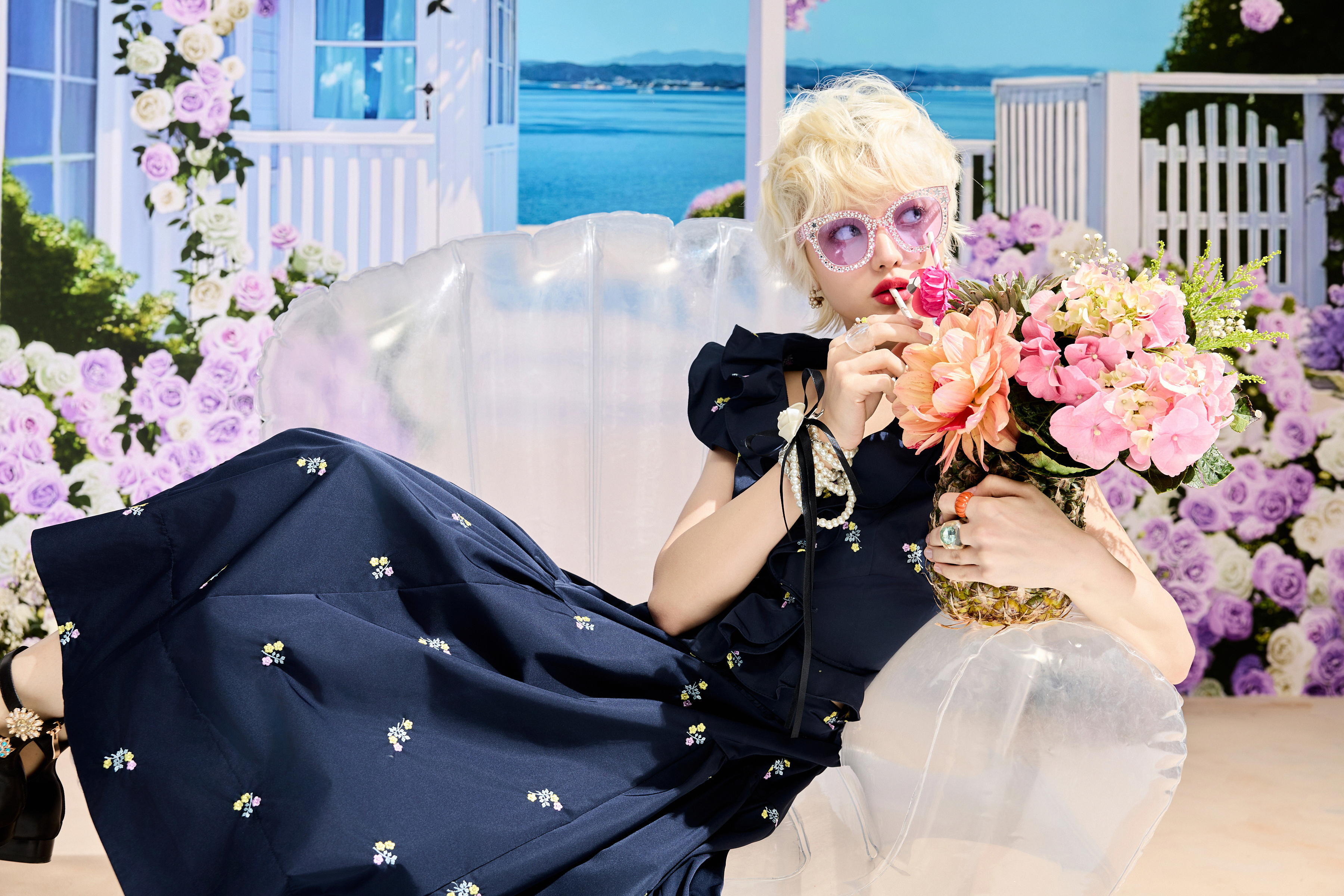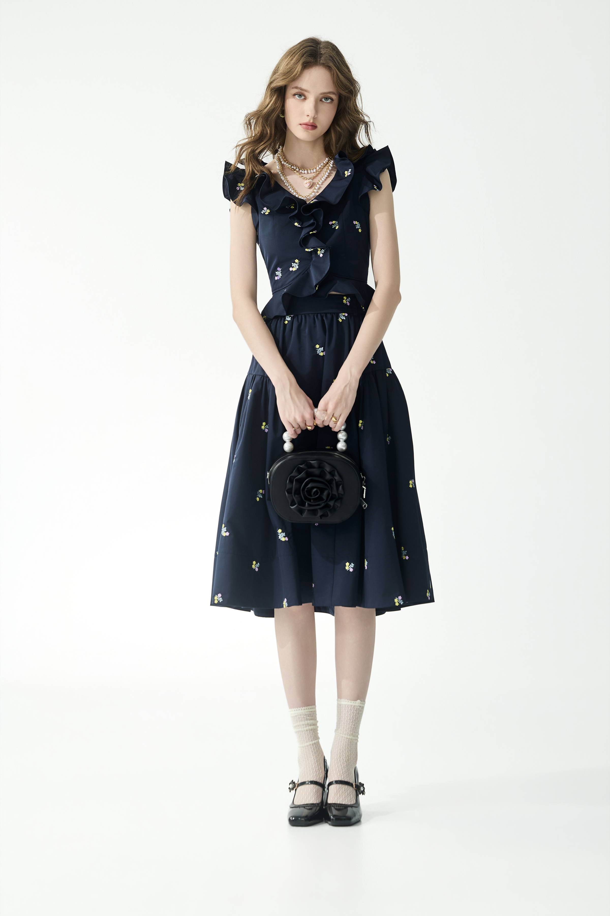 經典海軍藍為基調,背心上衣與中腰長裙綴以彩色花卉刺繡,並於藍韻汪洋之上縫製水手荷葉邊領口。材質上具備彈性與舒適機能,遊走於率性與甜美之間;而裙身在輕盈之中保有立體結構。