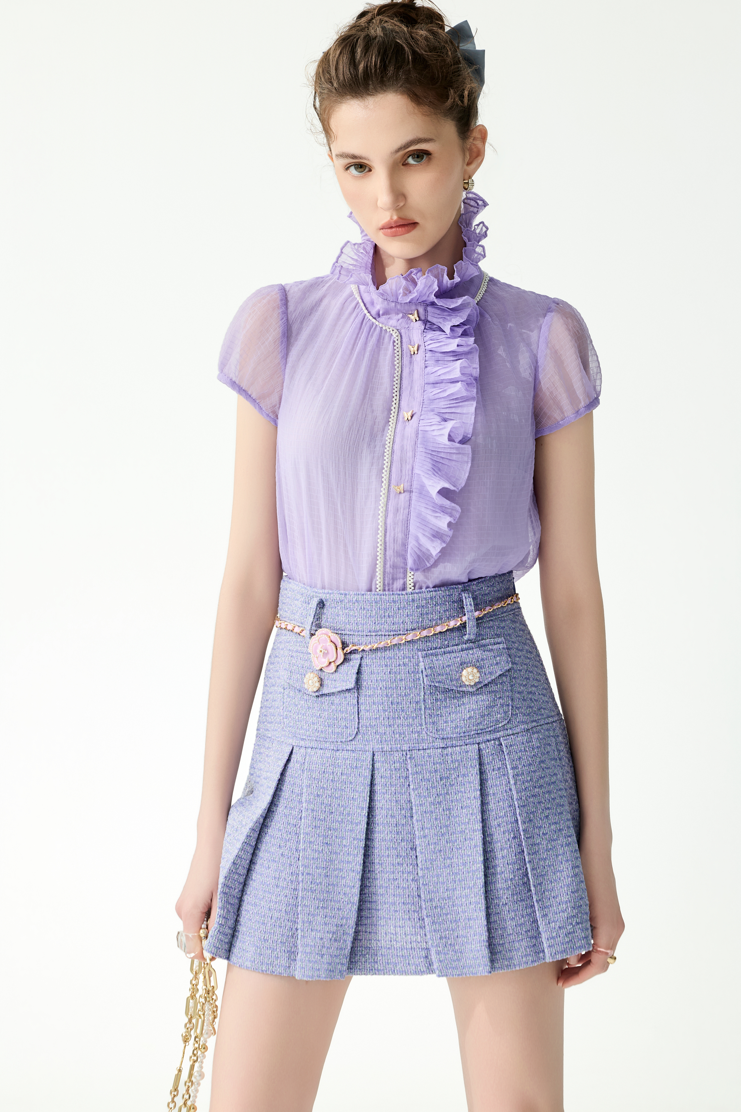小香風神秘紫花呢紗外套、小香風神秘紫花呢紗短裙、灰調葡萄紫格紋雪紡上衣