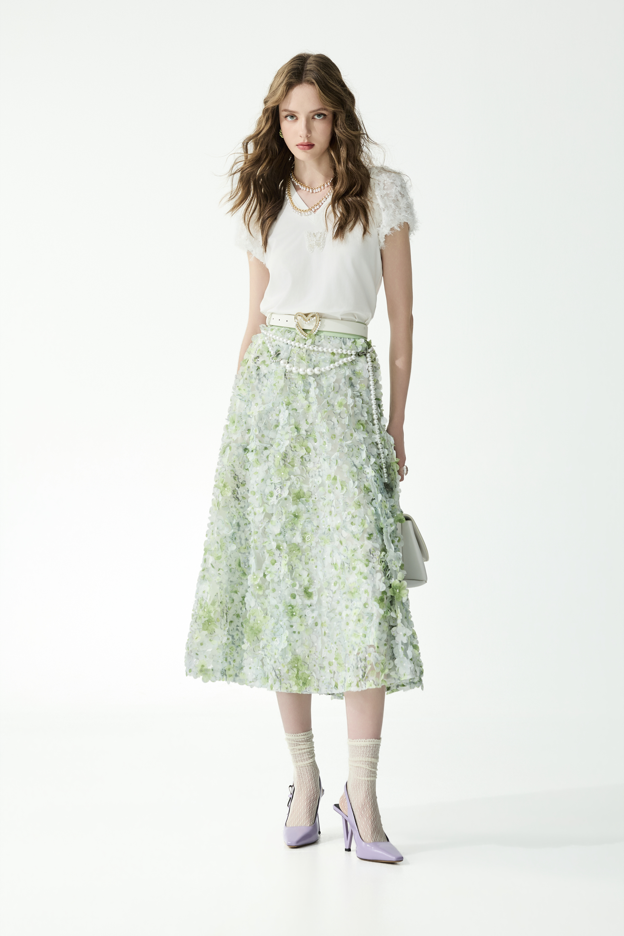 果凍薄荷色刺繡花瓣上衣、果凍薄荷色刺繡花瓣長裙、綴睫毛蕾絲袖T恤上衣