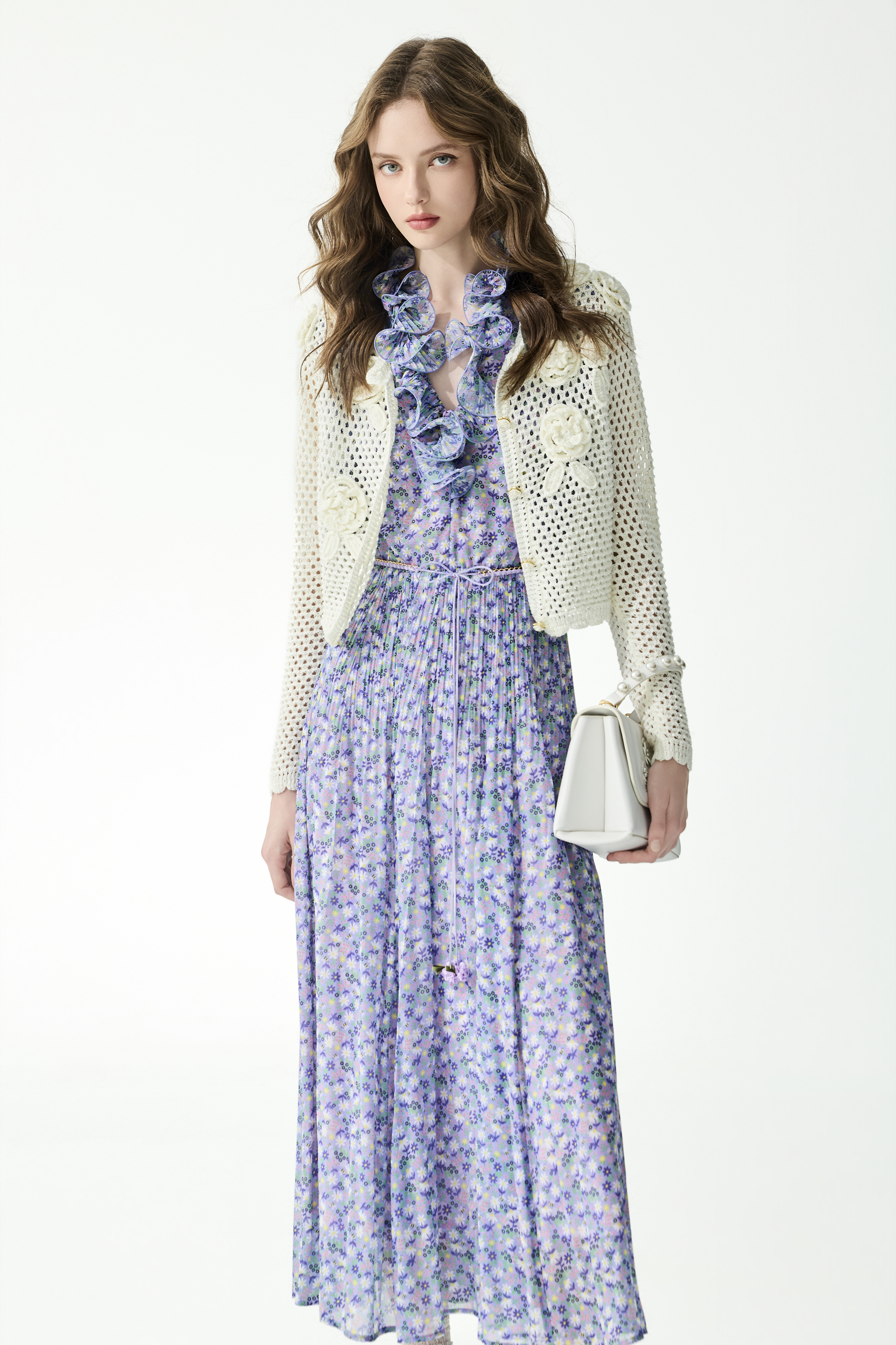 長版洋裝鋪滿動人的灰調葡萄紫花園印花,領口與袖口綴以壓摺小荷葉木耳邊,巧妙引導視線集中於上半身;活動式織帶腰鍊則強化腰線與身形比例,塑造修長的曲線美感。