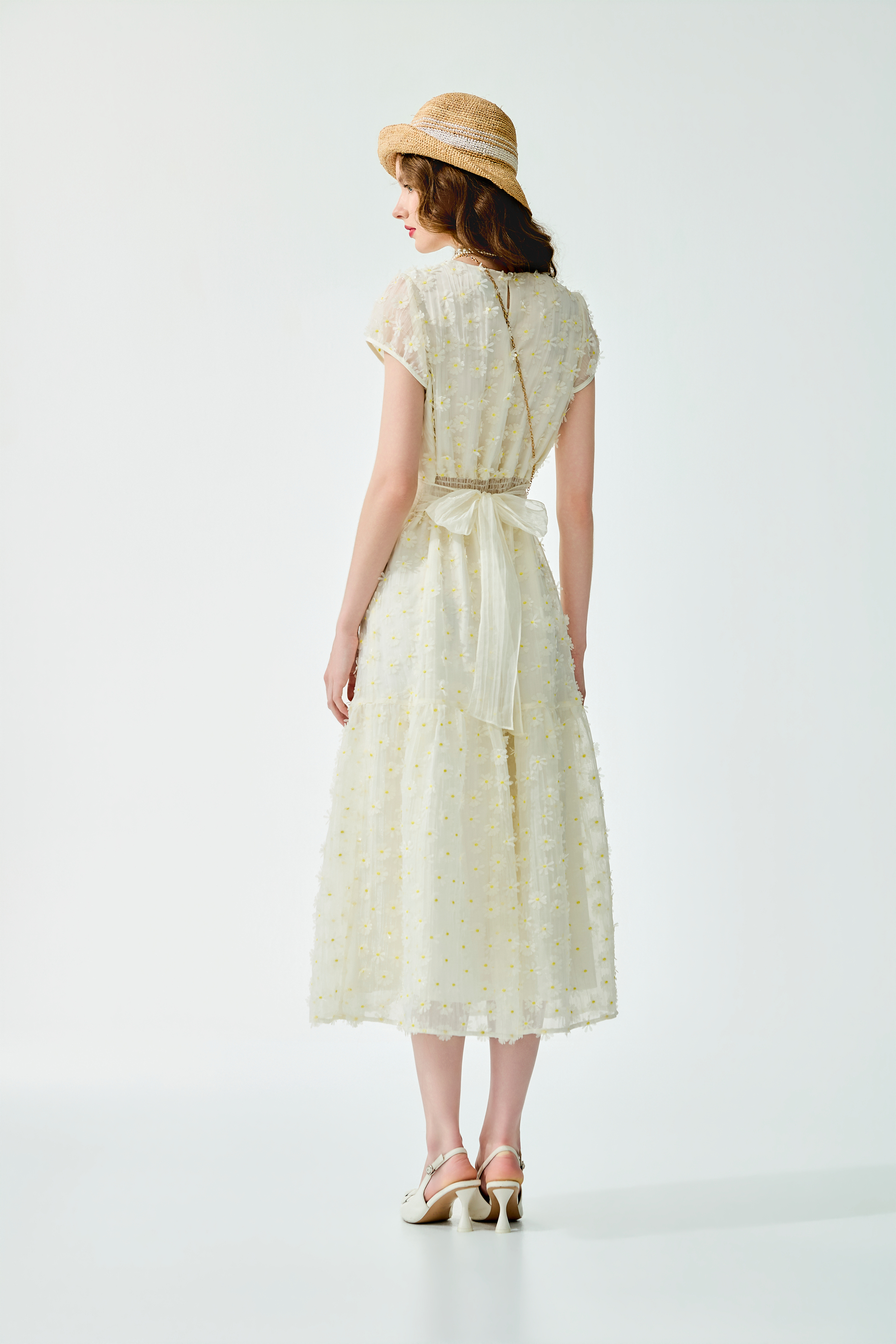 瑪格麗特花朵刺繡大量車縫於切腰長版洋裝上,帶來豐富觸感;裙身採飄逸壓縐烏干材質,即便暖春午後也能悠然著裝。後腰鬆緊與側邊綁帶提升活動便利性,並特別加入透氣薄層增加舒適度。洋裝附金黃花朵小包,點亮整體明亮黃調,延續溫暖明媚的春意氛圍。