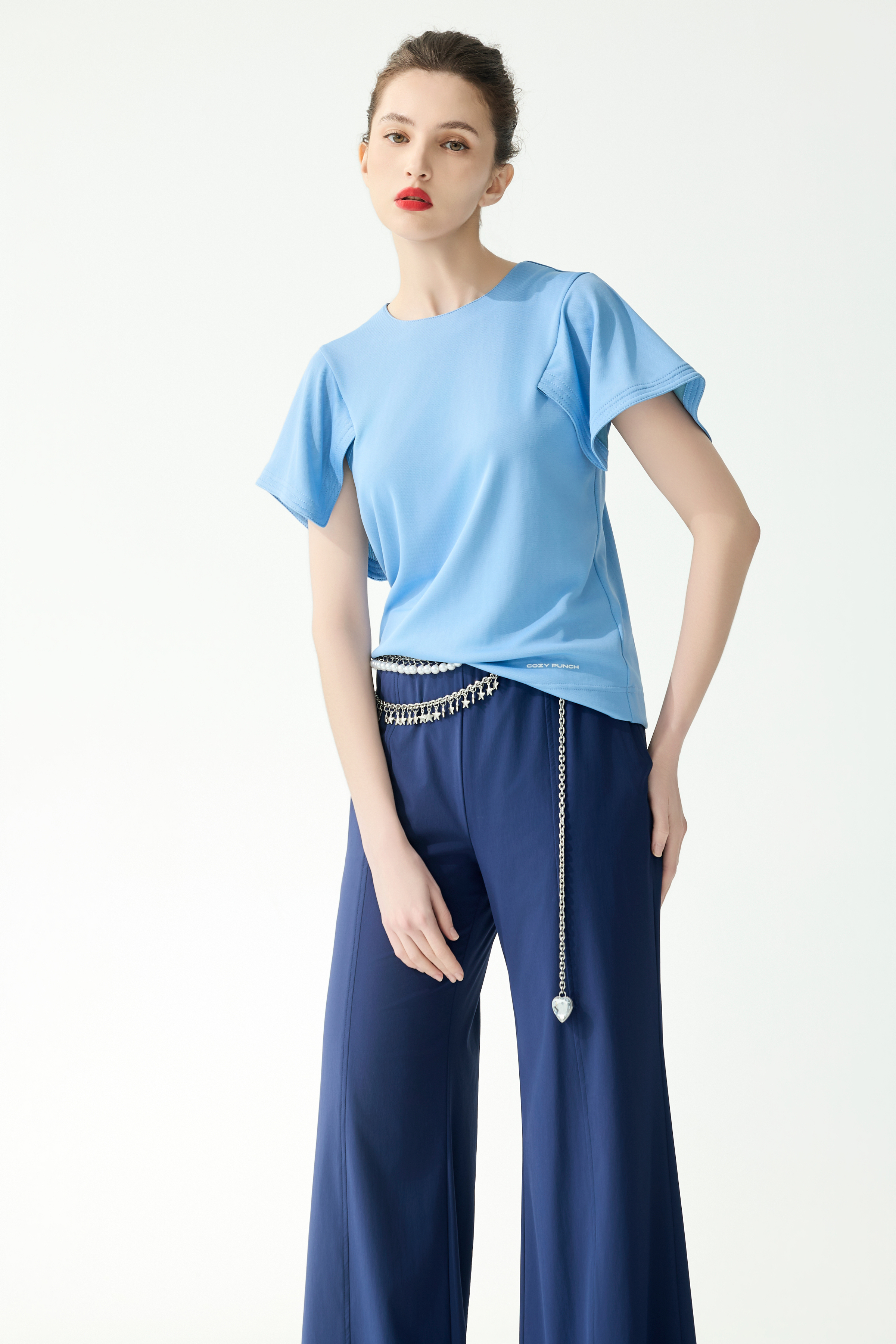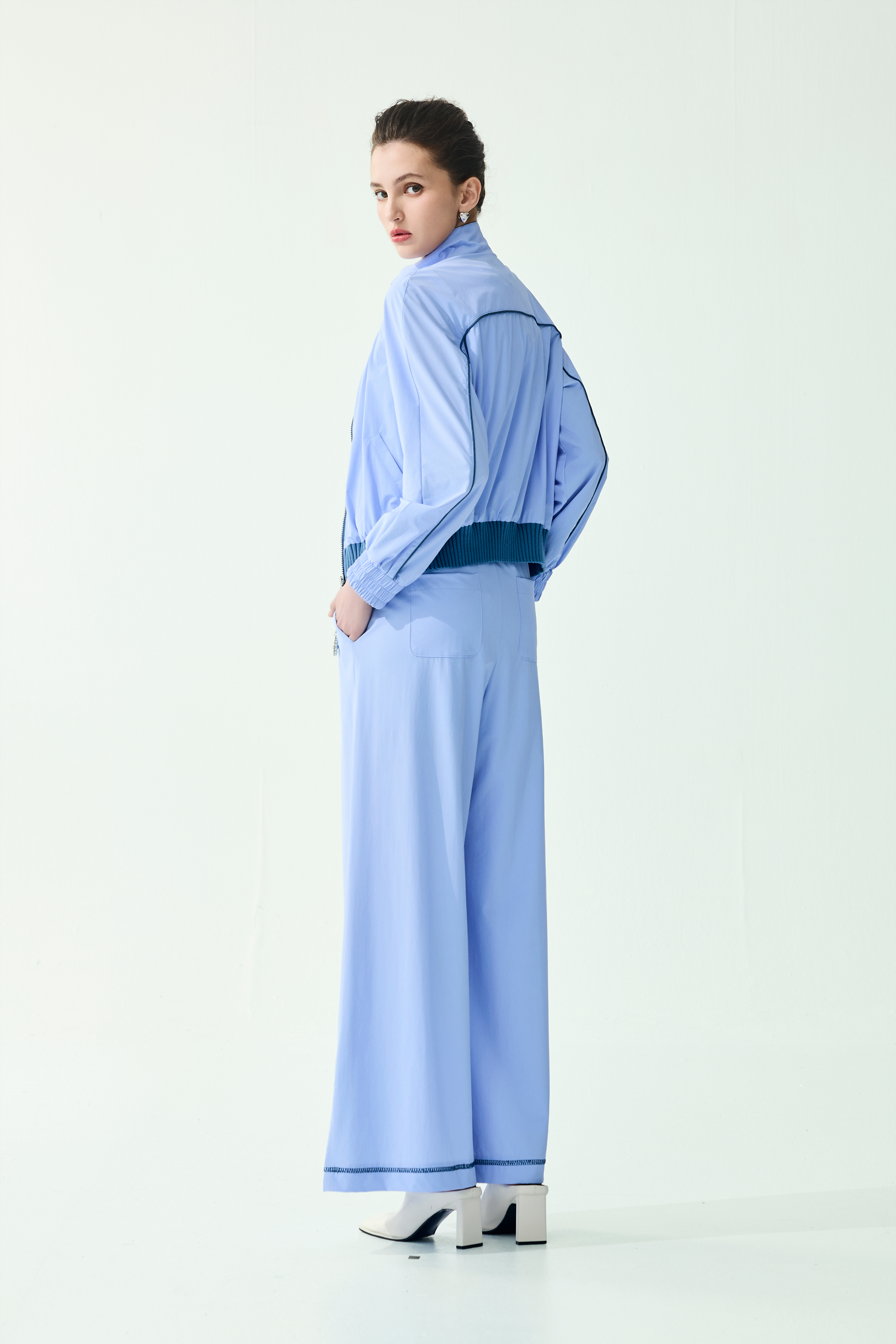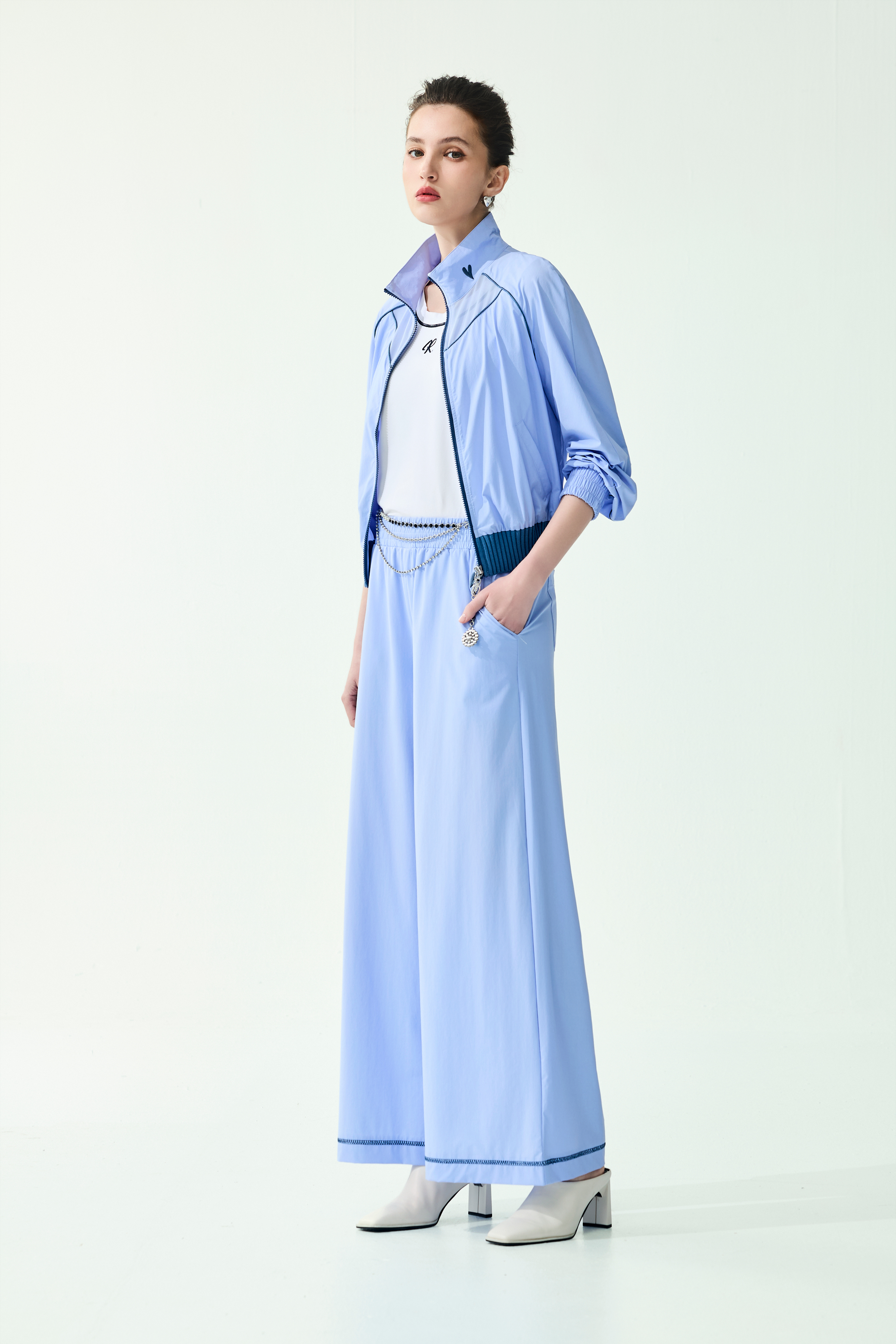 立領夾克透過細緻網紗拼接與出芽裝飾線為套裝加上時髦細節,羅紋收邊與剪裁勾勒纖細腰身;寬腿長褲則以流動廓形延伸比例,清爽色調呼應春季晴朗天光,勾勒自在從容的都會女性優雅姿態。