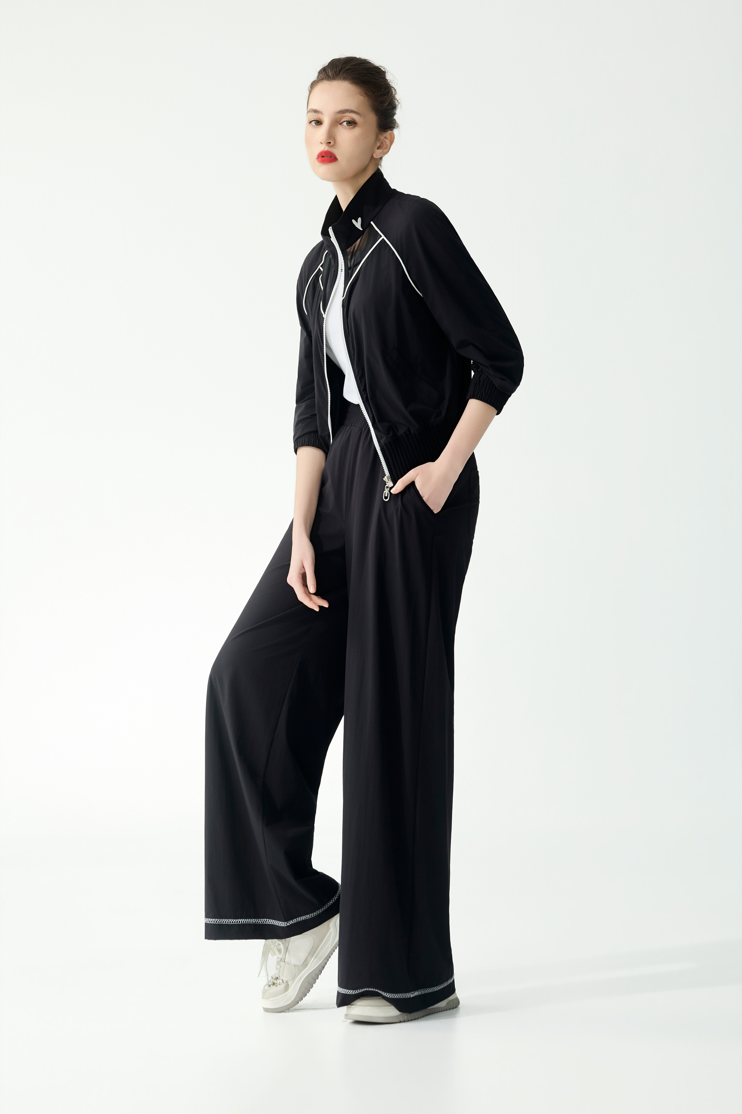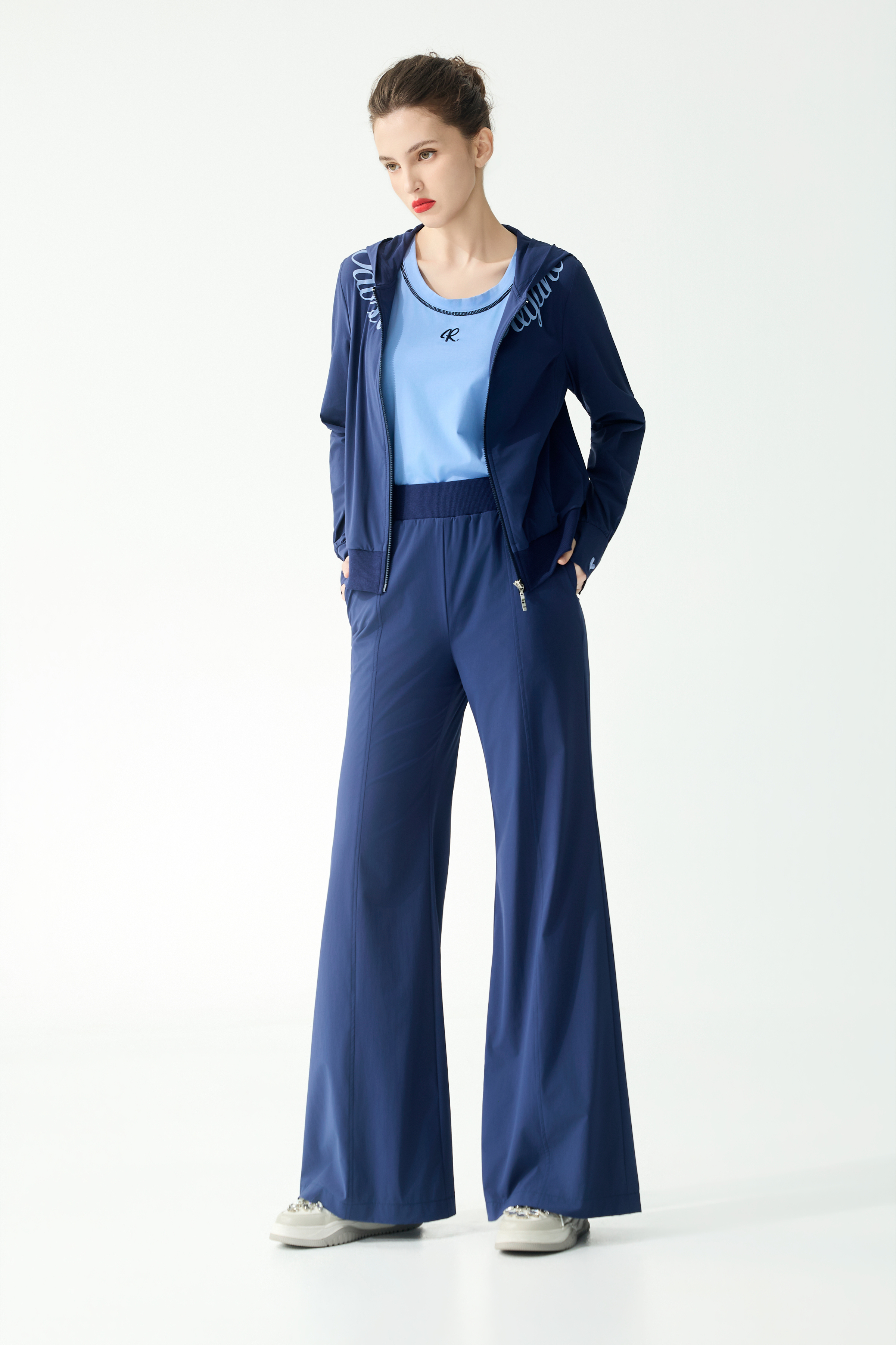 膠原蛋白 · 機能 ONE TONE 輕鬆駕馭休閒日常,演繹都會白領的俐落特質,將「穿搭即養膚」昇華為每日儀式。連帽夾克以字串印花與小巧愛心刺繡點綴,為休閒服增添個人風格;寬腿長褲結合細膩的彈性羅紋設計,兼具修身比例與自然流動感。