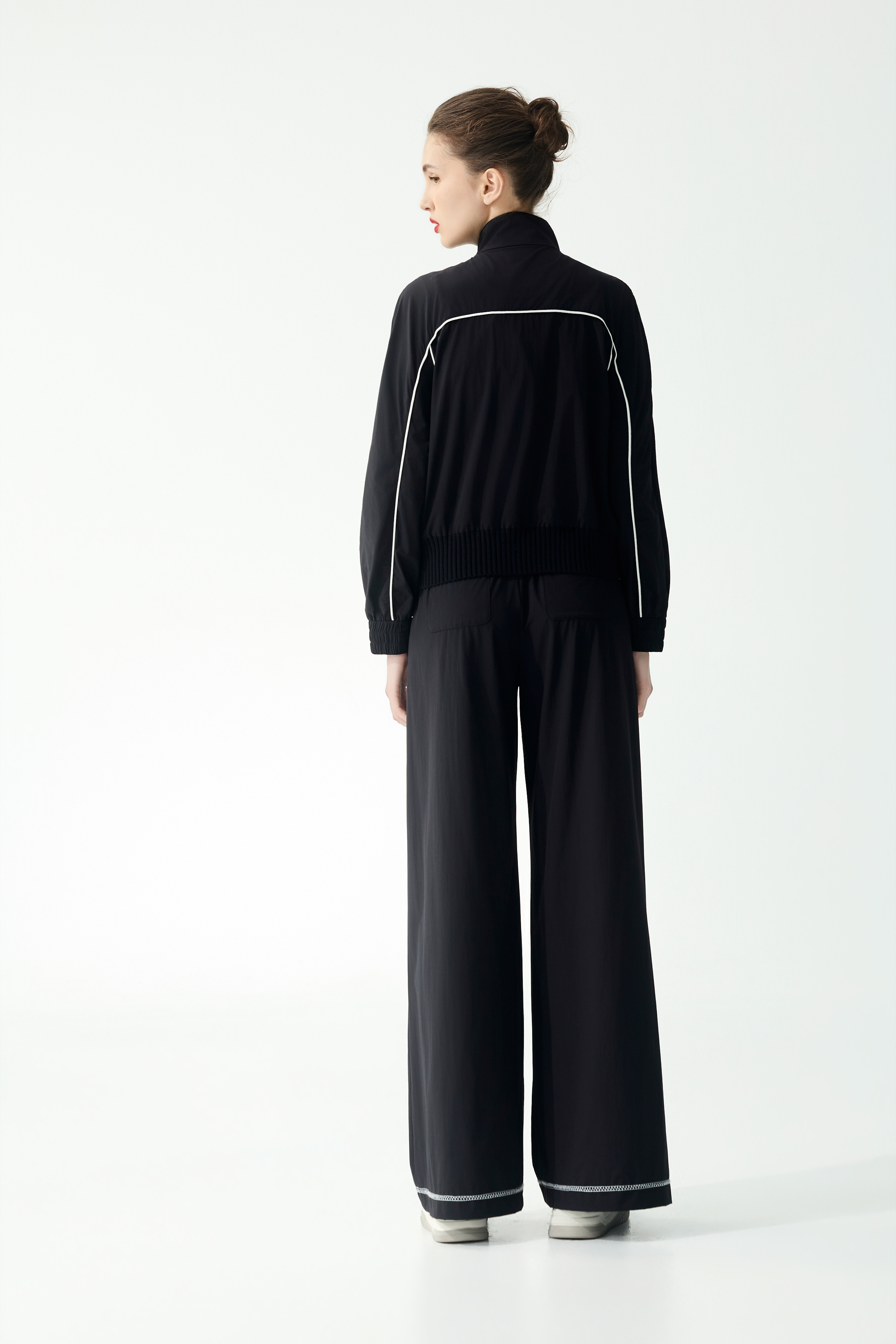 拼接透視網紗膠原蛋白外套、下擺配色線膠原蛋白寬腿褲、極簡合身鑲色邊 T 恤背心