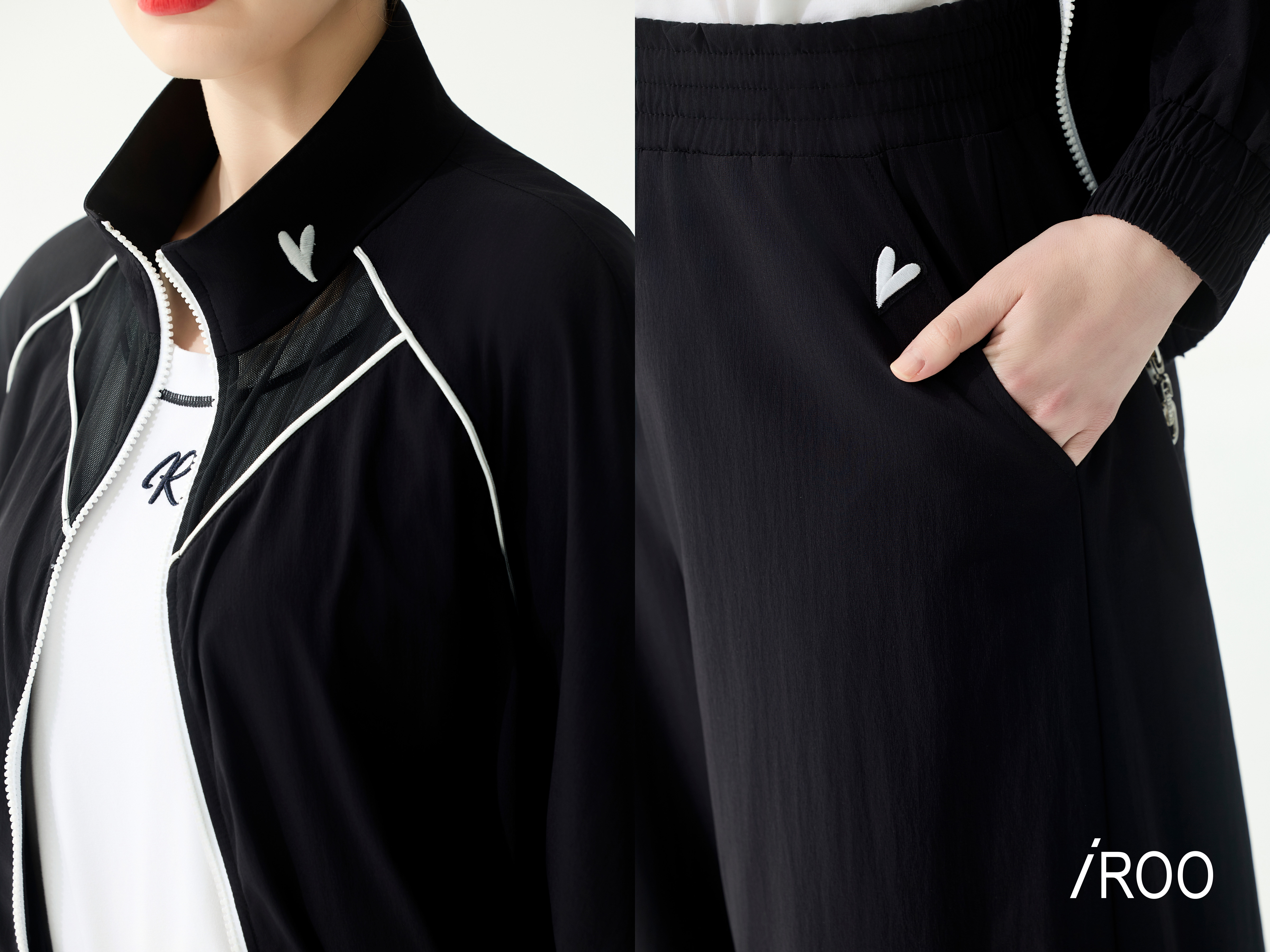本月膠原蛋白系列亦推出極具摩登感的雅致黑系套裝,除了完美展現比例的羅紋收邊版型外,黑系領口與腰頭的白色愛心刺繡更為醒目,低調點綴女性甜美魅力,於衣著之中流露對非凡品味的自信追求。行走於城市節奏與輕旅時光之間,定格不費力卻盡顯高級格調的每一刻。
