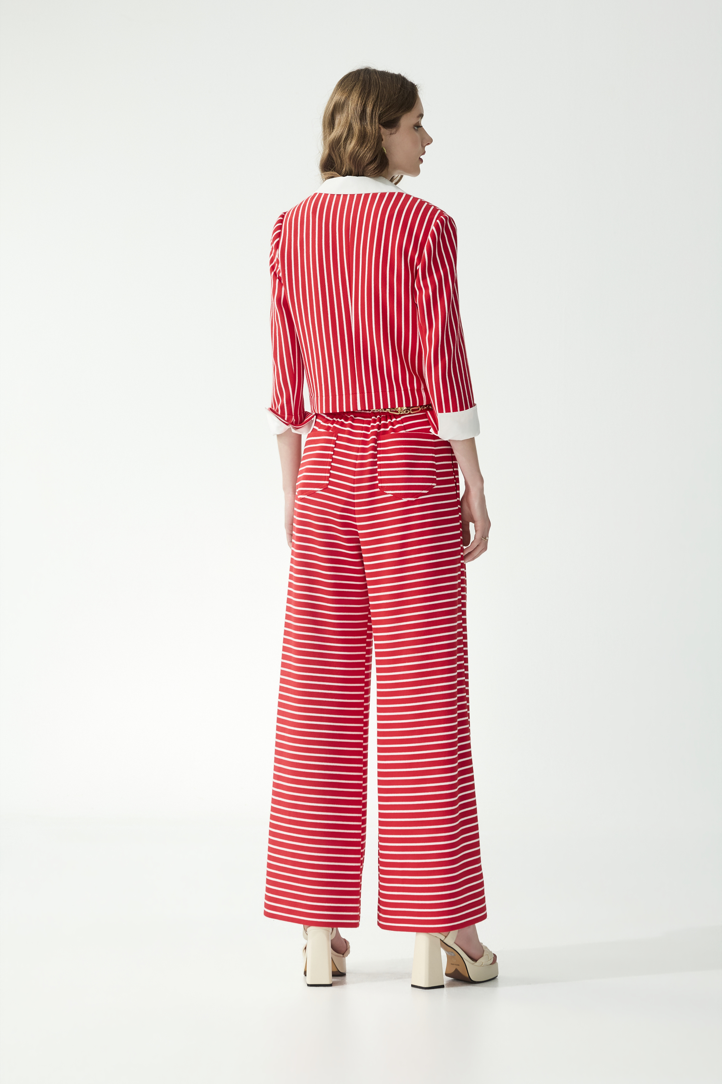 短版外套透過滿版直橫條拼接,以整齊線條交織給出俐落時尚感。反白雙層袖口設計,營造出豐富的穿衣層次;以及精緻袖扣上的船錨圖樣,為水手風情增添識別度。下身同色系寬腿褲,則以流暢的廓形隨步伐自然延展比例,同時具備舒適與造型感。