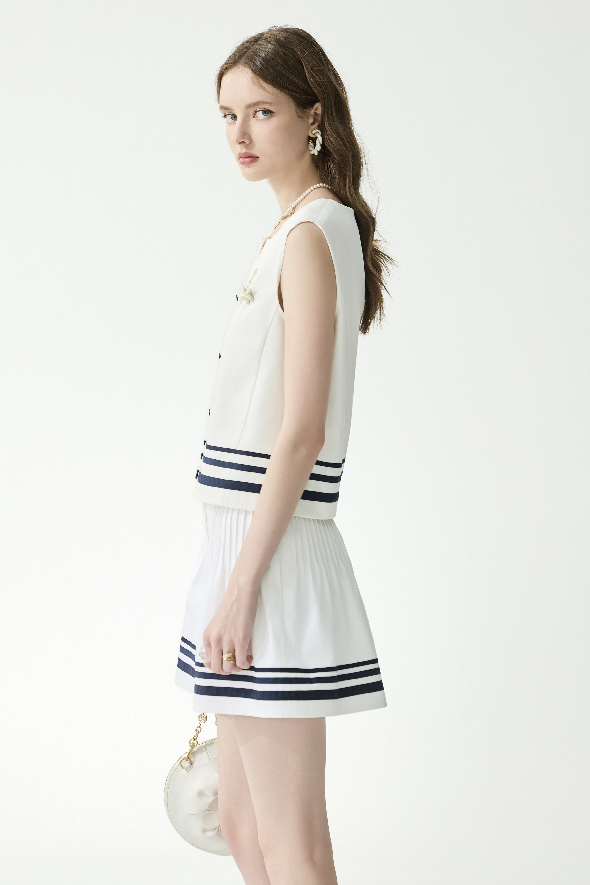 光學白系就此輕盈展開,帶出純淨俐落的都會氣息。方領無袖背心透過配色織帶鑲條與織布鈕釦設計,大方釋放簡約質感與女性內斂氣場,並用珠鍊船錨加以點綴,讓人眼睛為之一亮。獨特的下身褲裙則以微寬廓形與立體細摺條製造澎裙效果,使平凡日常也能散發新意。