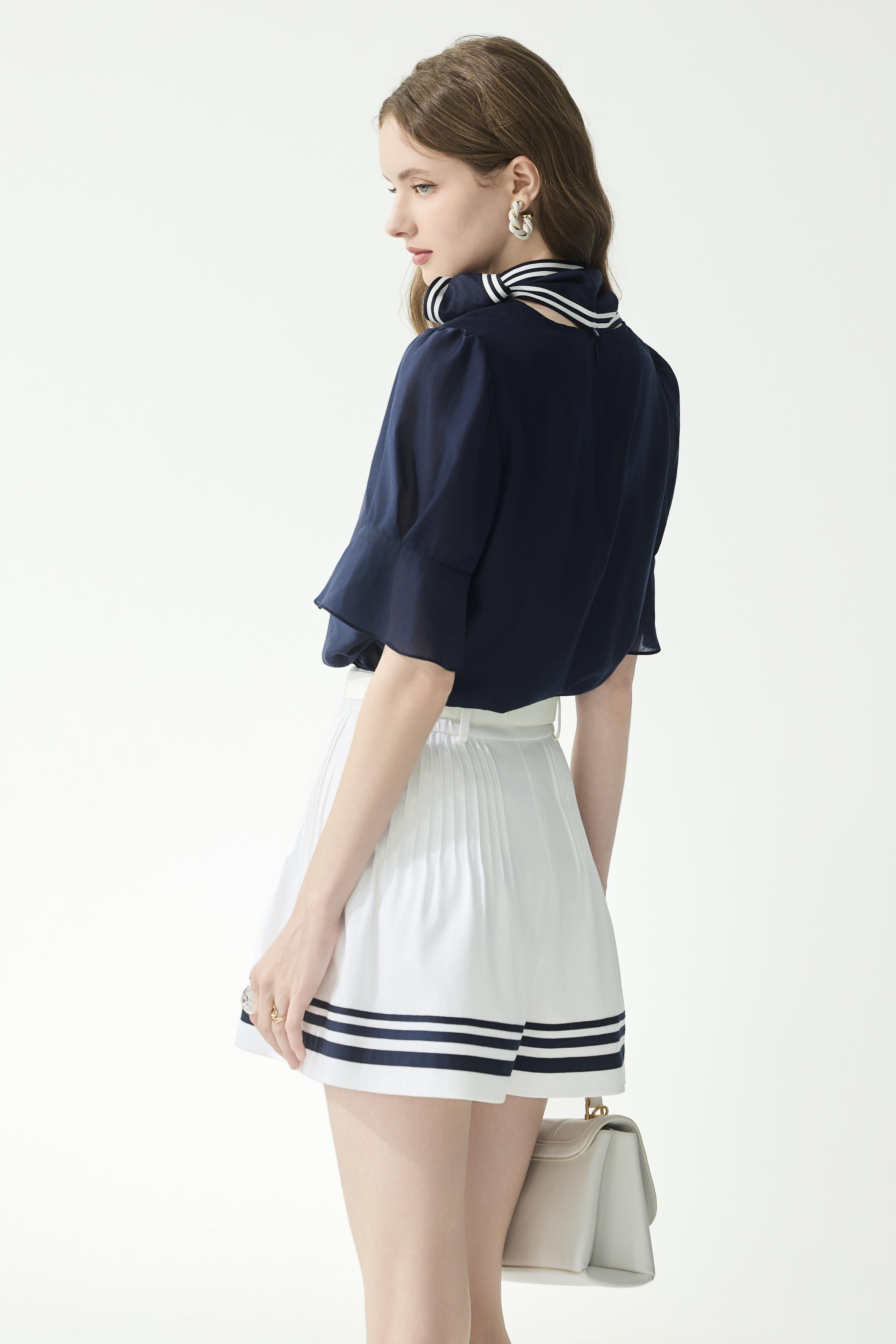 綴活動絲巾水手風上衣、織帶鑲條飾澎褲裙