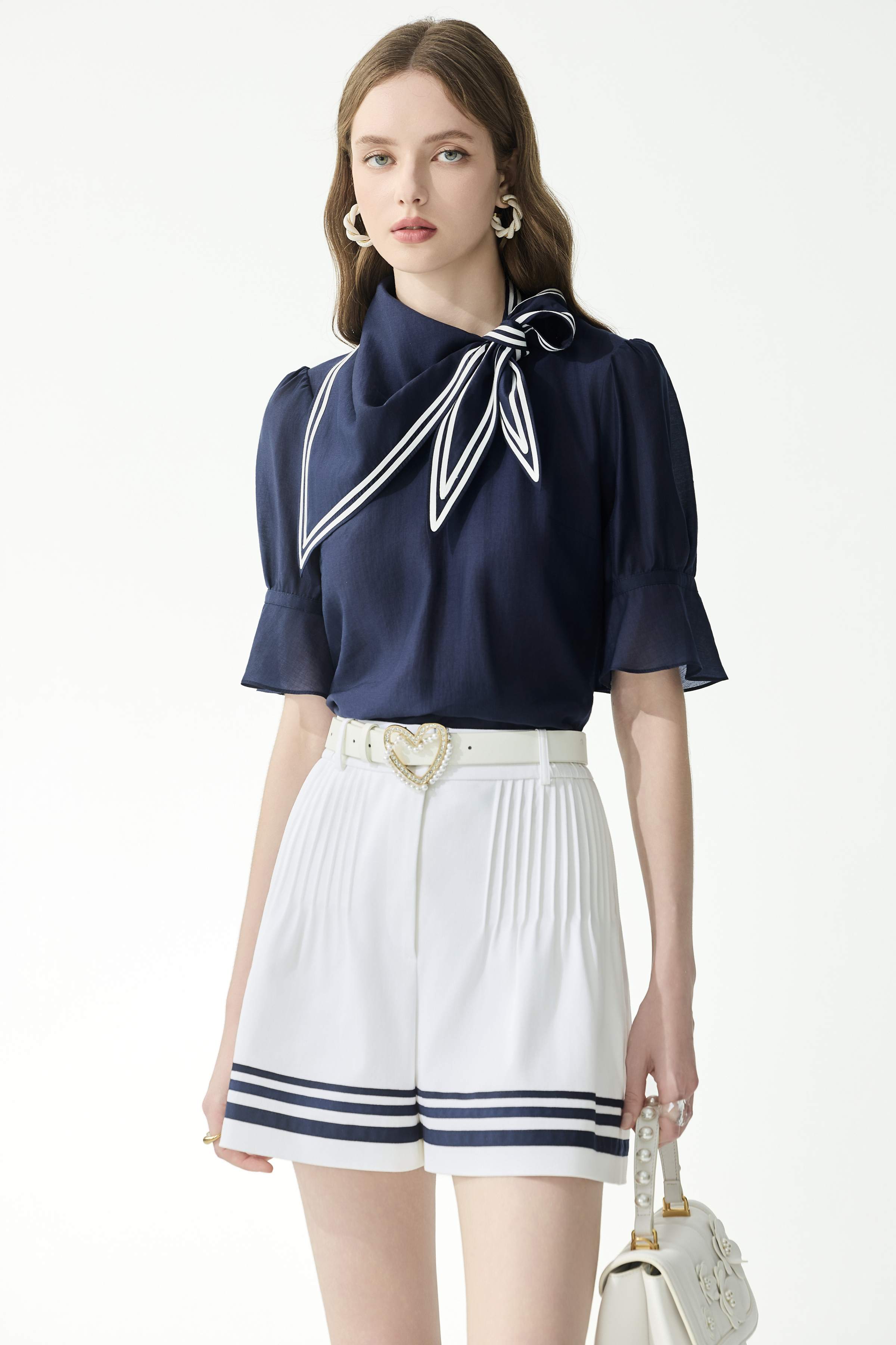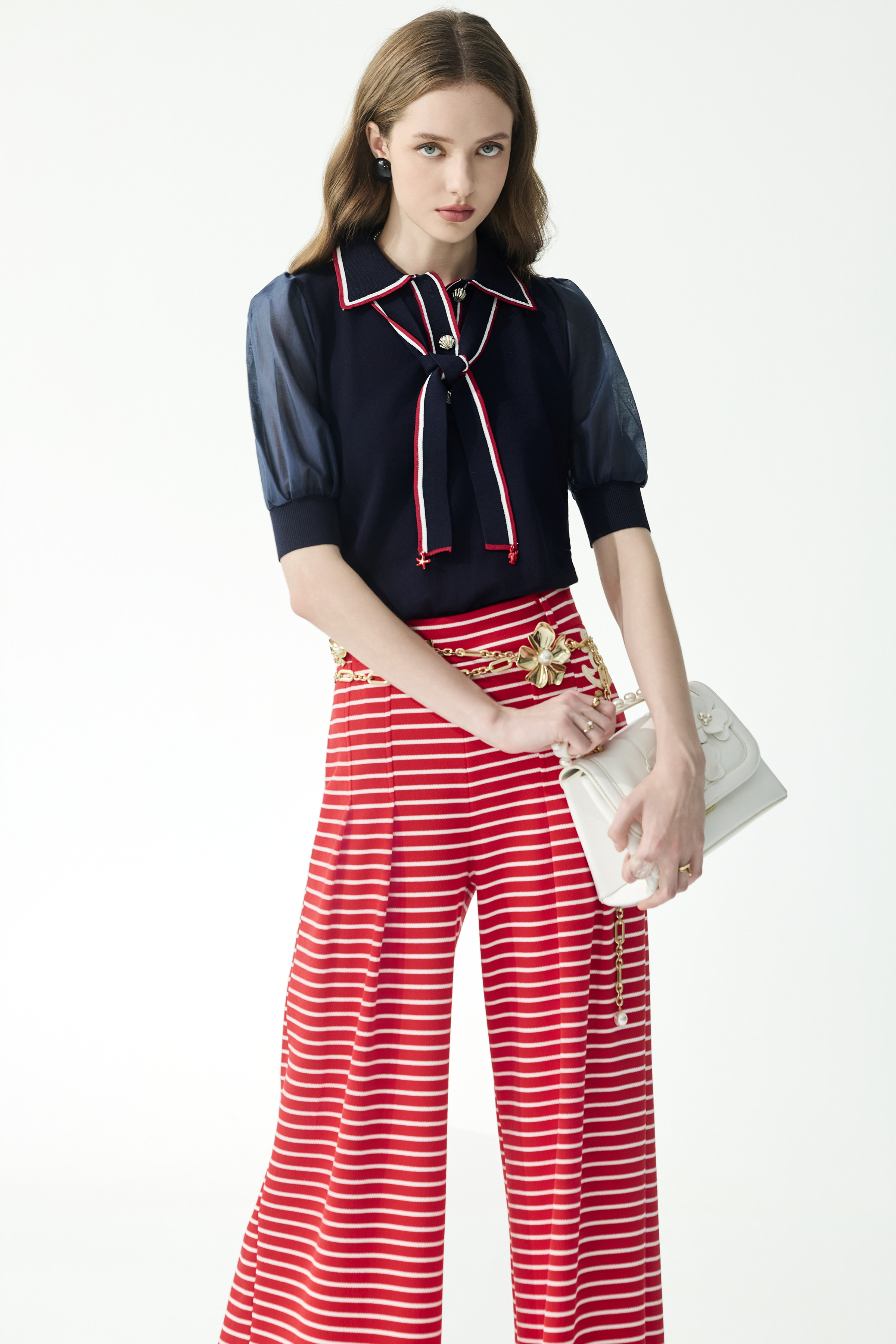 大方領短袖針織上衣揉合公主一字領版型,以海軍藍與光學白凸顯甜美氣質,是少見的雅致單品。配飾方面,水手領結與本單元鑲邊元素巧妙呼應,完美呈現吸睛的類蝴蝶結視覺。柔軟針織修身親膚,為衣著提供更靈活多元的選擇。