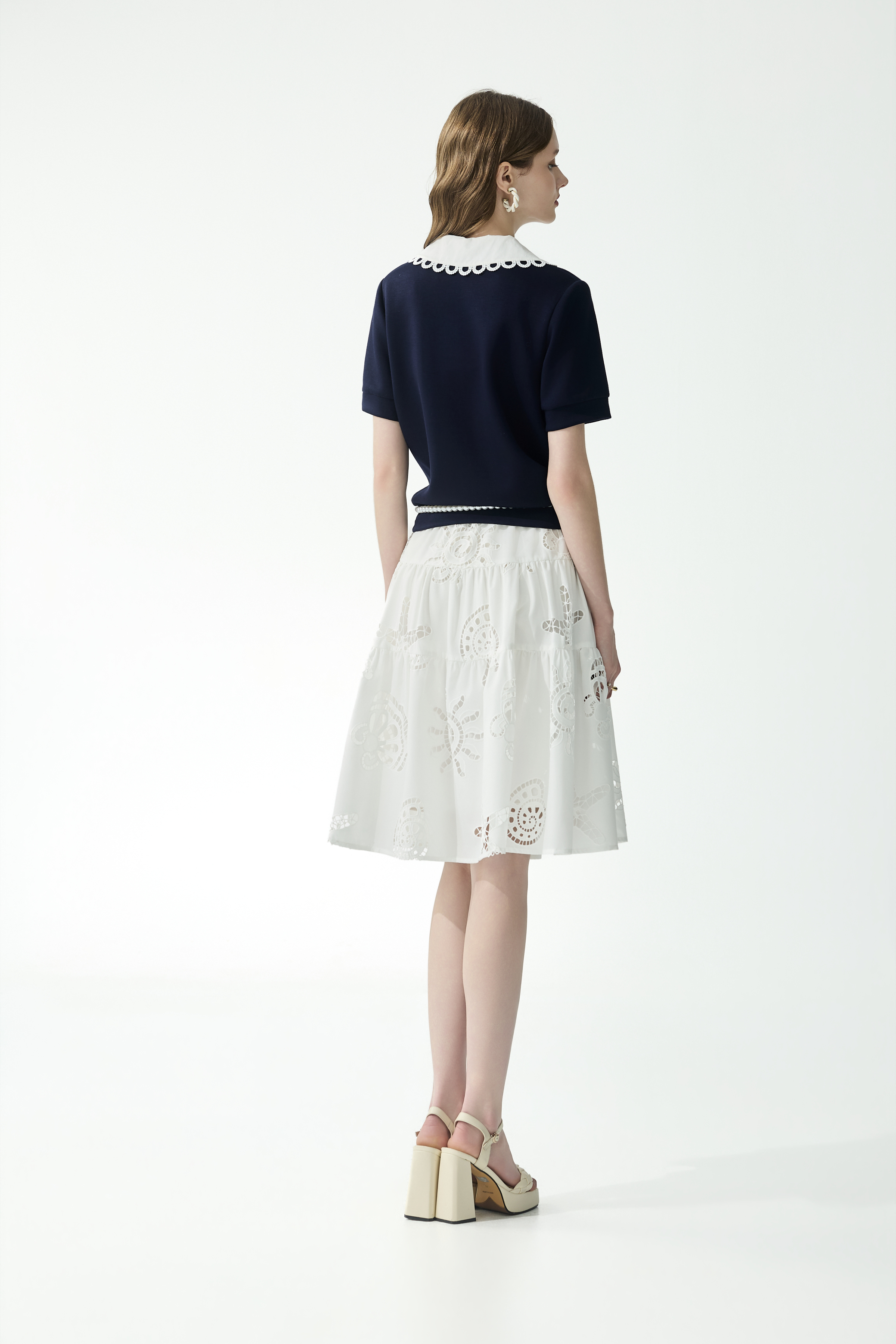 中低腰裙以抗皺棉質製成,廣泛運用多種海洋生物做為裙身上簍空刺繡,展現細膩工藝與清雅趣味。適度融入活潑元素,使半長裙不顯沉重,同時流露輕快的深海靈感,打造工作日也能駕馭的休閒姿態。