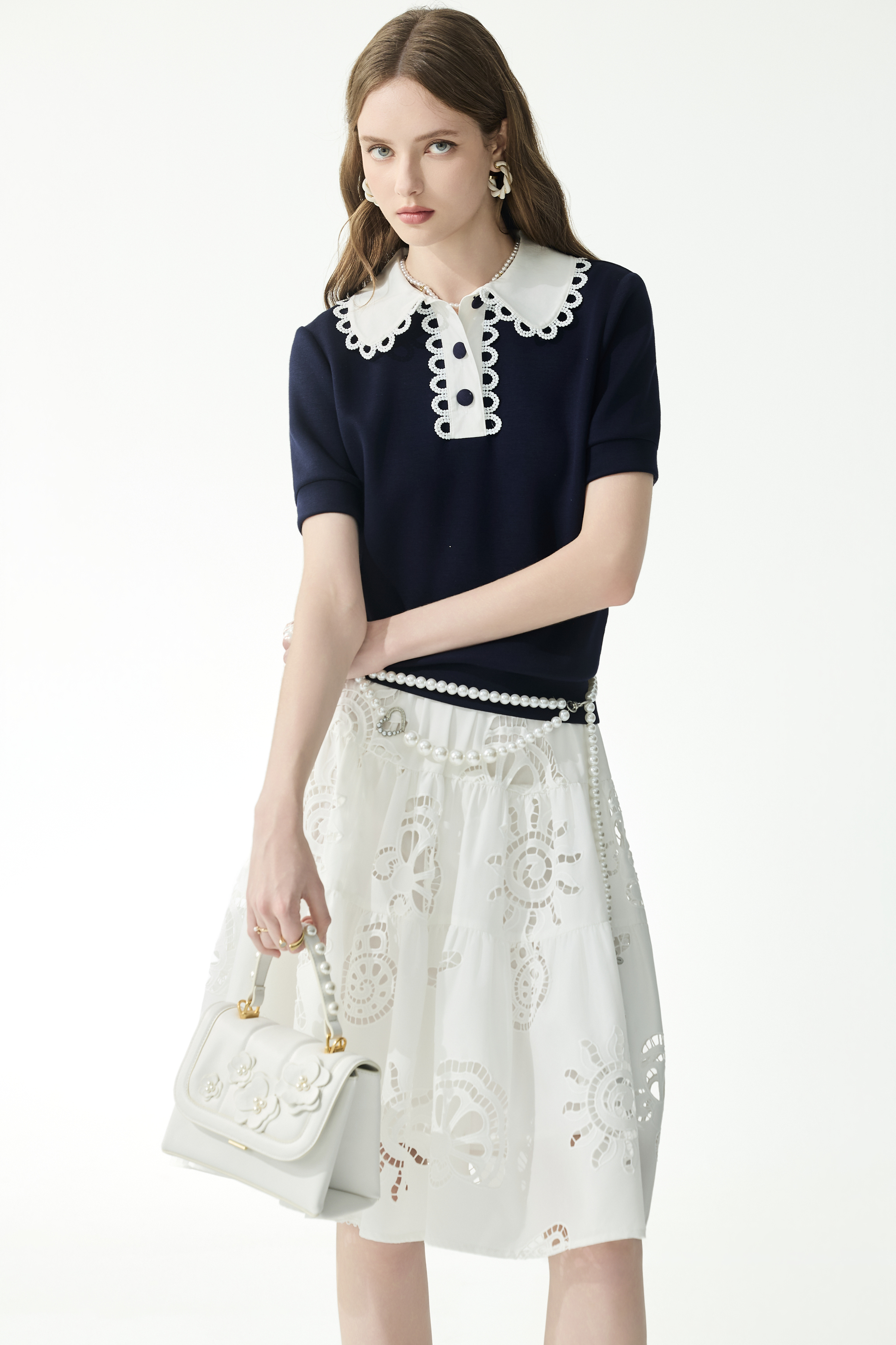 蕾絲花瓣鑲邊POLO衫、海洋生物簍空刺繡裙