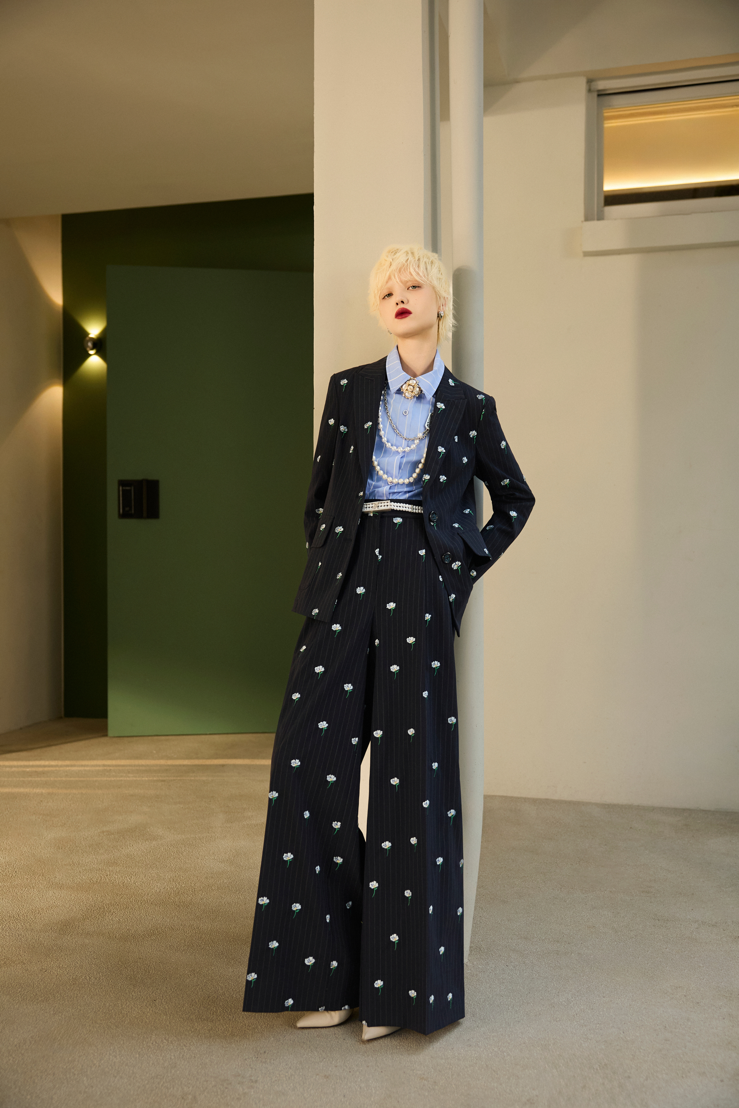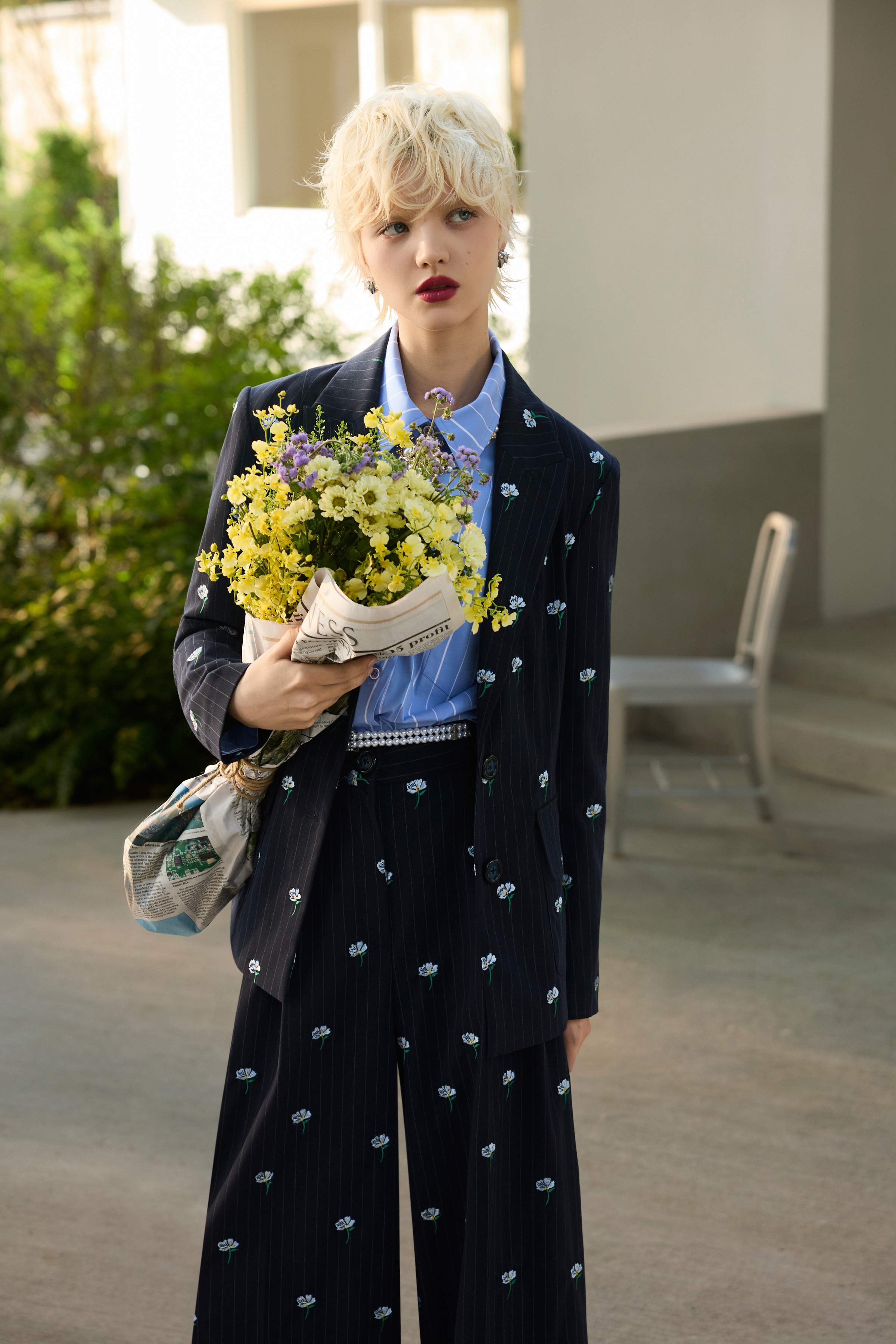不僅以溫室花卉刺繡作為本套裝的亮點,若隱若現的條紋套料也成為細膩基底,巧妙點綴花卉刺繡。中低腰微鬆緊寬腿褲配雙口袋,讓嚴謹日常也能呈現鬆弛感。翻領西裝外套延續刺繡技藝,並配有輕巧肩包撐起廓形,展現都市中幹練又時尚的暖春輪廓。