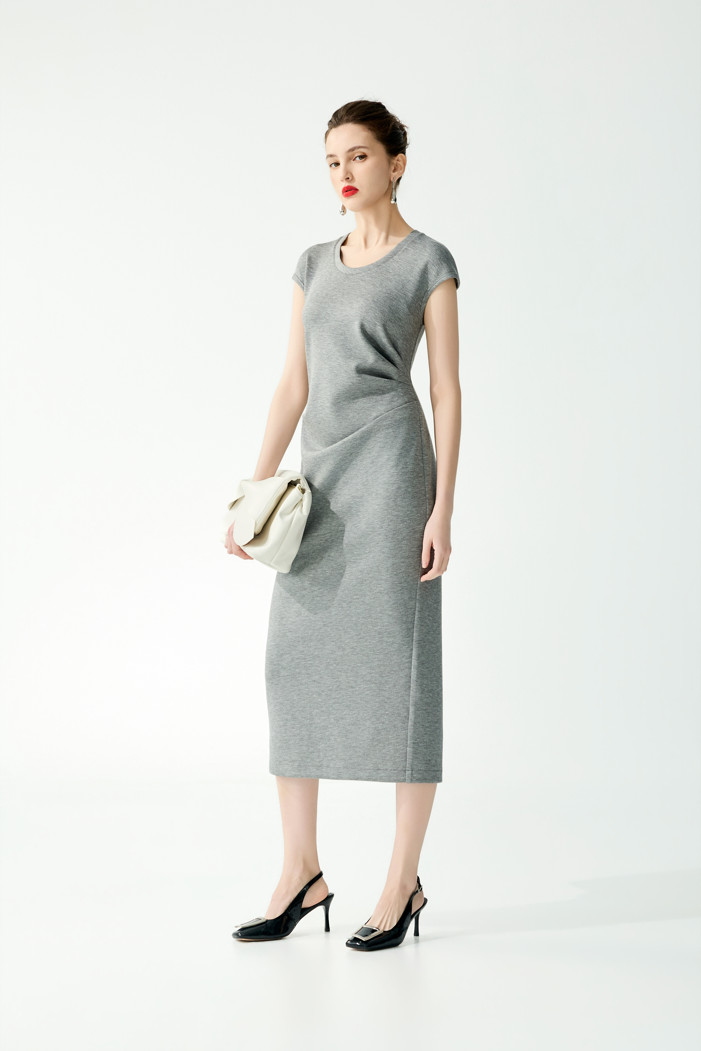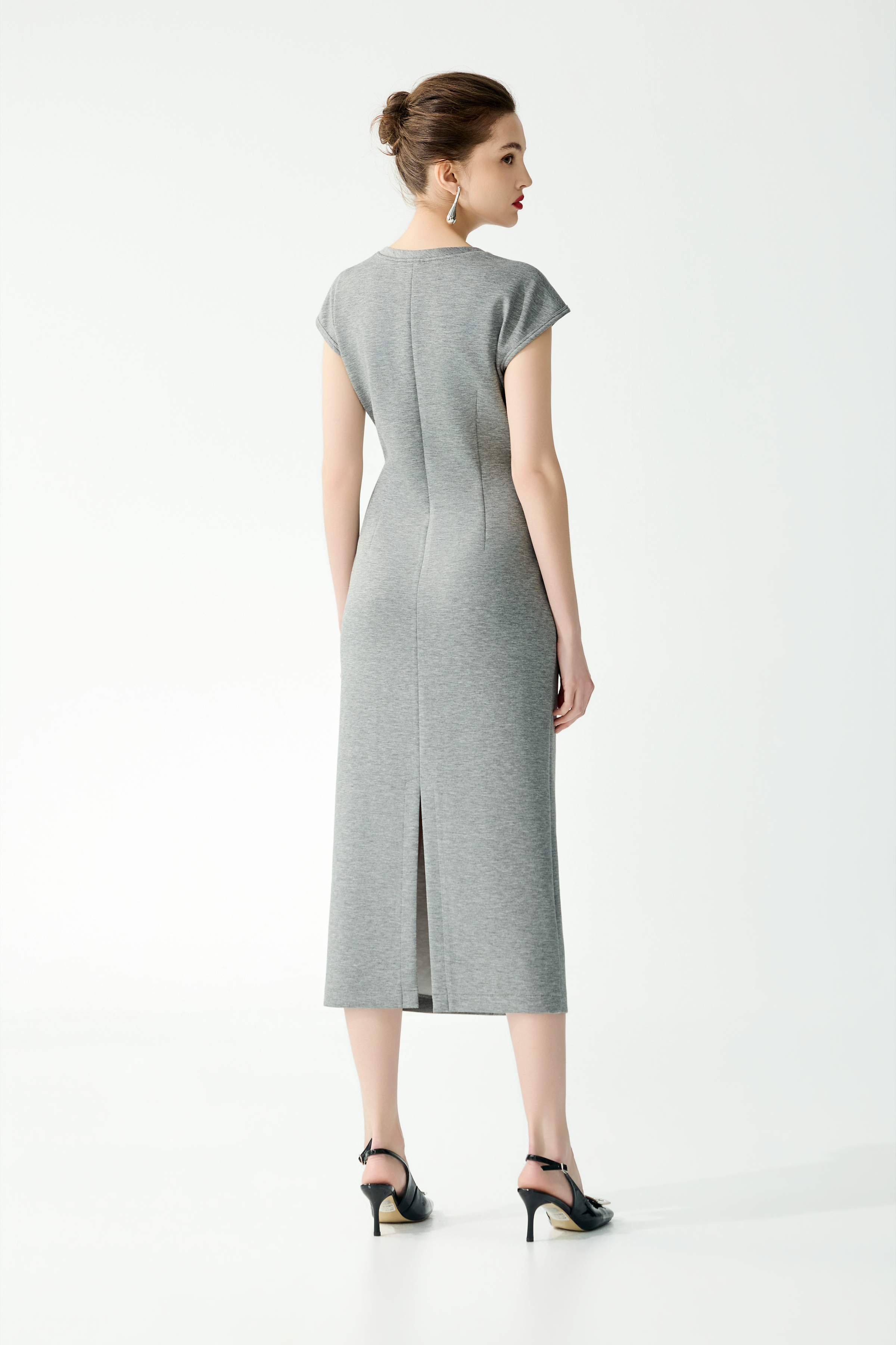 終極灰洋裝腰部縫製抓摺收腰線,巧妙勾勒身形曲線,視覺上展露出女性在工作或約會時的幹練態度;後下擺開衩則為每個角度增添一絲性感氣息,步伐間散發自信魅力。