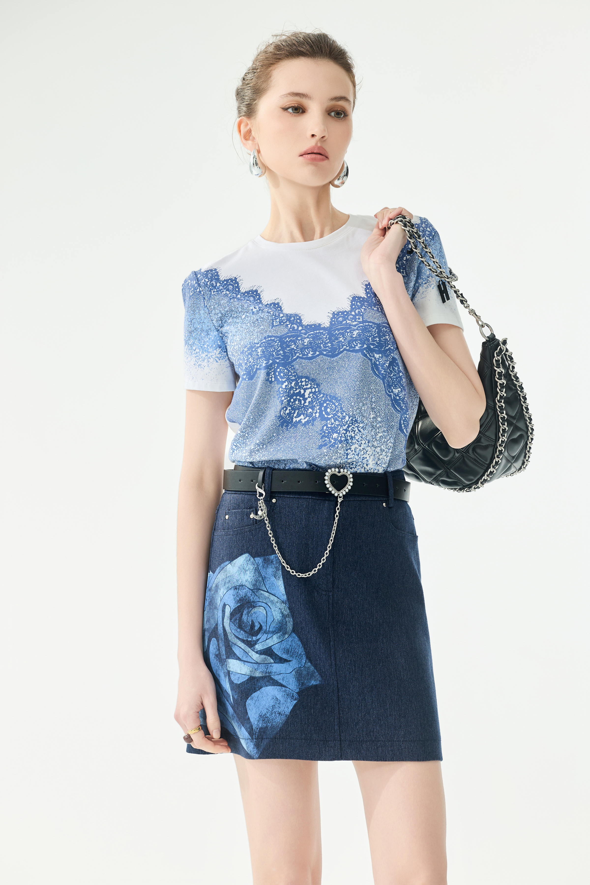 上衣採略鬆腰身設計,不僅修飾身形比例,也釋放出新世代女性的柔美氣質,不過於緊貼身形。T 恤上 iROO 獨具特色的丹寧藍蕾絲印花,同時營造出蕾絲背心疊穿的假兩件效果,實用百搭又趣味十足。