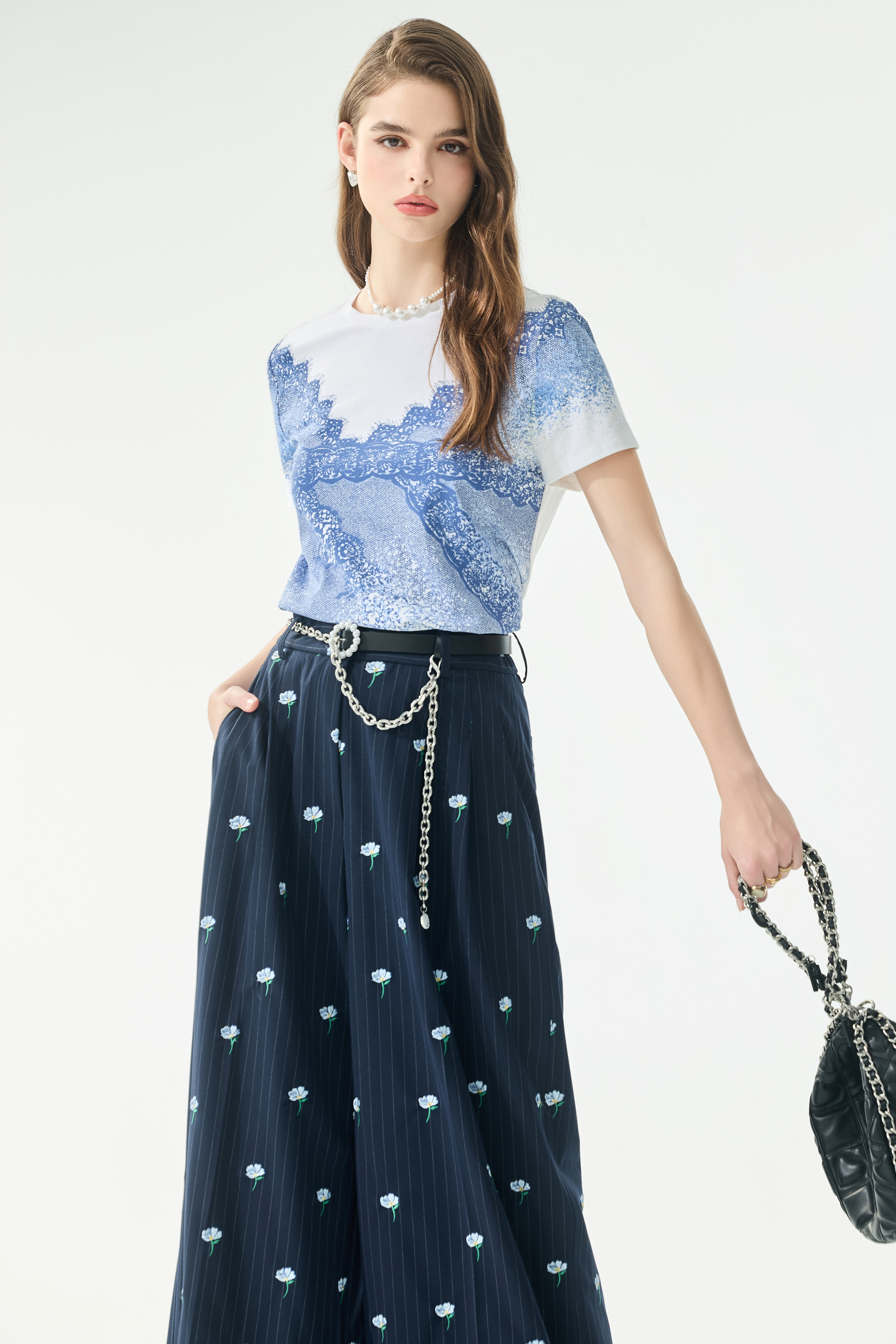 綴單寧藍蕾絲印花T恤上衣、單寧藍玫瑰印花短裙、溫室花卉刺繡西裝寬褲