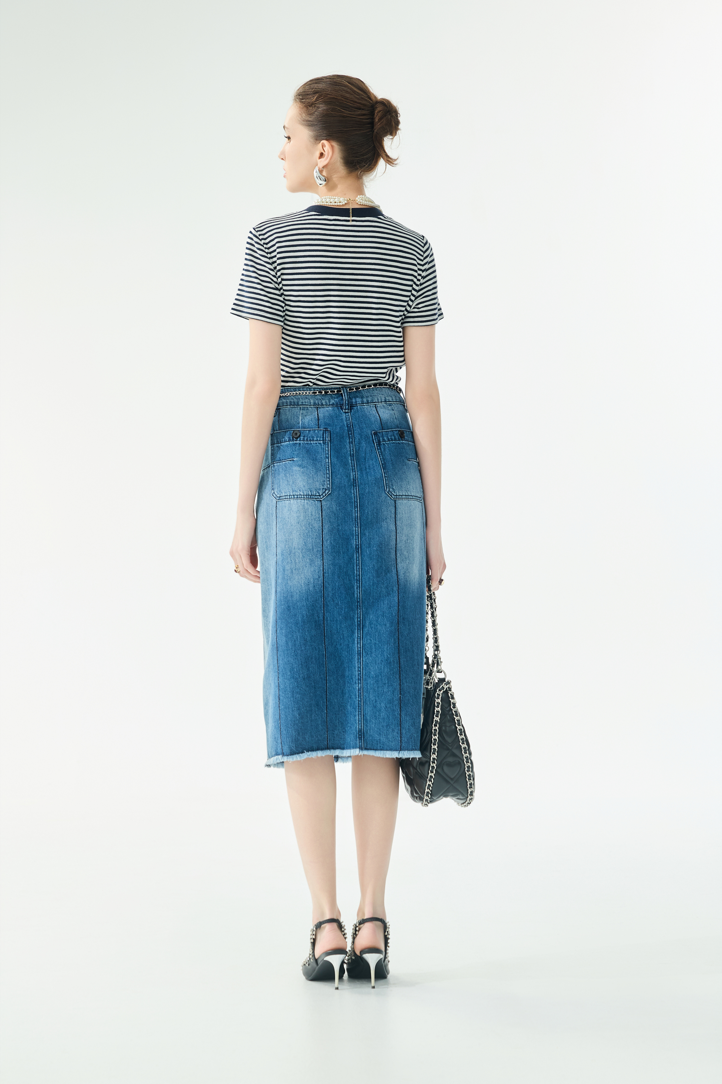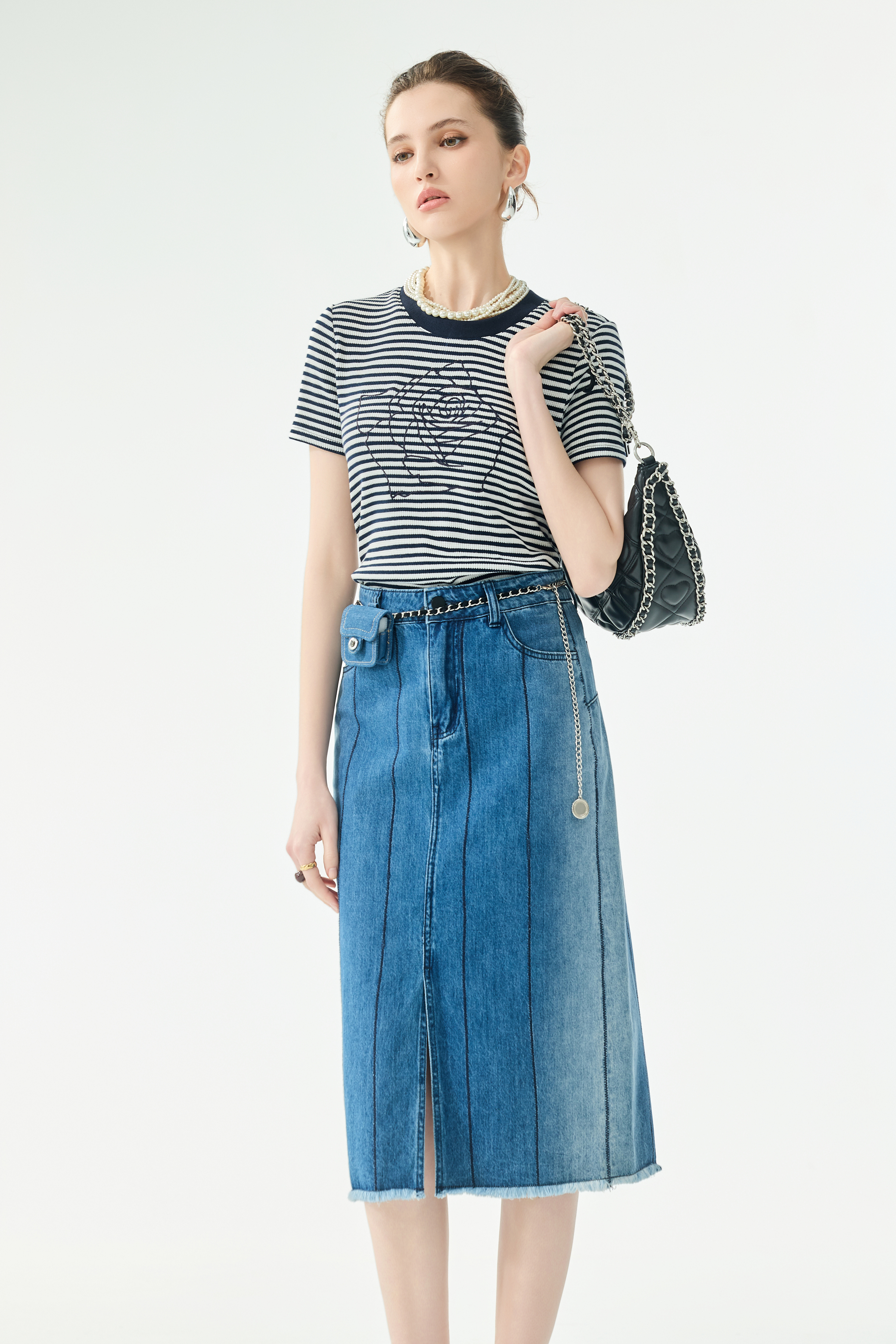 中長版牛仔裙上的漸層水洗面料,少見地以刺繡線條妝點,與牛仔裙色調交織出豐富層次;前下擺開衩增加了雙腳擺動靈活度,腰上繫有精巧鏈條腰包,兼具實用機能,帥氣隨性呼之欲出。