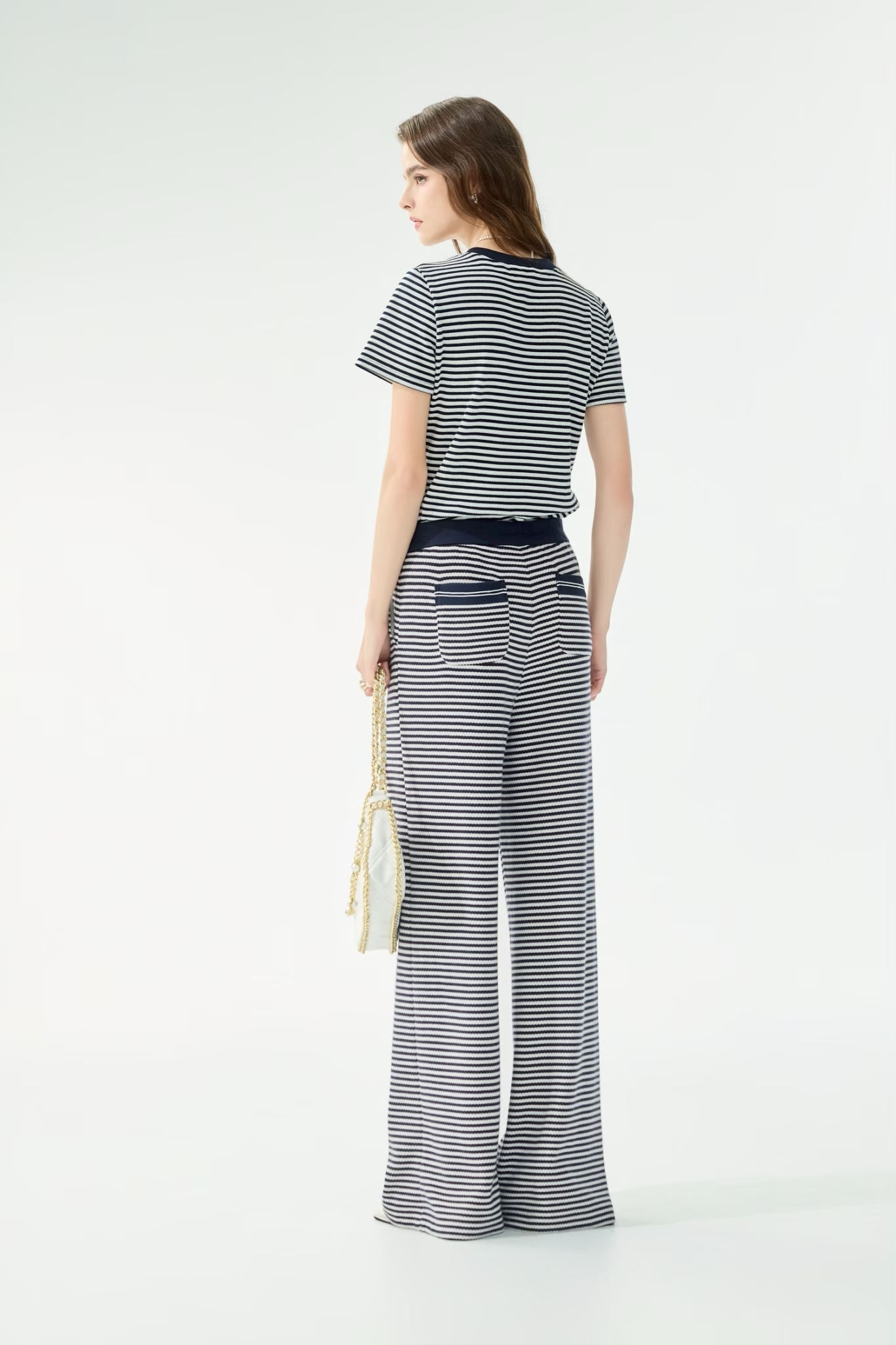 條紋套裝以彈性材質打造舒適剪裁,寬褲搭配羅紋腰頭與線條刺繡,以及裝飾腰帶環與四口袋等細節,在風格中凸顯獨特個性。上身有玫瑰花刺繡做為視覺焦點,並於領口縫製同系列拼接羅紋,為整套造型增添設計感,讓女性得以同時保有自由隨心卻有型的都會印象。