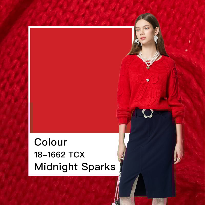 大圓領長袖單品針織上衣,流行火焰色,綴立體蝴蝶結造型,佐以鑽飾。
