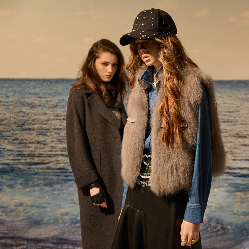圓領長袖夾克式外套,整件小羊皮,流行森林河色,做幾何切割線條造型,前中拉鍊閉合,領口磁釦吸合。